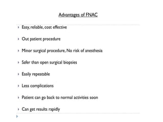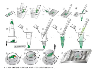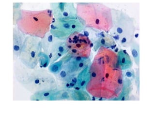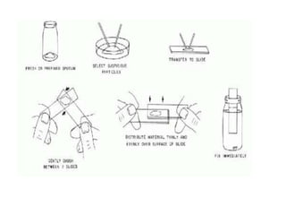 This document provides information and instructions for various cytological tests including Pap smear, sputum/bronchoalveolar lavage, urine examination, fine needle aspirate collections, and gastric lavage/esophageal brush smears. It describes how specimens are collected, transported, prepared as smears or cell blocks, and fixed prior to staining and examination under a microscope. Proper collection and handling procedures are outlined to ensure optimal specimen quality and diagnostic accuracy. Common fixation methods, staining techniques including Papanicolaou, hematoxylin and eosin, and May-Grunwald Giemsa are also summarized.