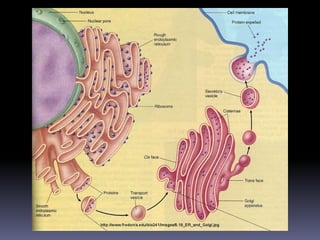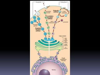 The document discusses the endomembrane system, including the endoplasmic reticulum (ER) and Golgi complex. The ER is divided into rough ER, where proteins are synthesized, and smooth ER, which functions in lipid and steroid synthesis. Newly synthesized proteins are modified in the Golgi complex through glycosylation as they progress through cis, medial, and trans cisternae. The trans Golgi network sorts proteins to their final destinations, such as secretion or lysosomes.