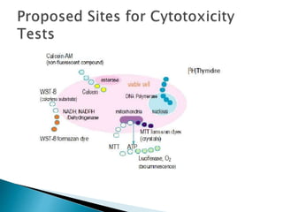 This document discusses methods for evaluating the cytotoxicity of nanoparticles. It describes several common cytotoxicity assays including MTT, WST, trypan blue exclusion, and assays using dehydrogenases. The MTT assay measures mitochondrial activity and is widely used. WST assays use water-soluble reagents and do not require crystal solubilization. Dehydrogenase assays offer high sensitivity by measuring multiple cell elements. The document also provides examples of studies that used these assays to evaluate the cytotoxicity of silver nanoparticles, magnetic nanoparticles, and other nanomaterials.