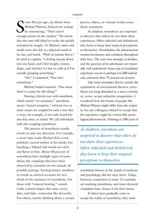 This document discusses synesthesia, a neurological phenomenon where senses are joined so that stimuli from one sense simultaneously evoke sensations in another sense. It provides examples of synesthetes who see letters and numbers as colored or experience tastes as physical touches. While once dismissed, research is now accumulating evidence that synesthesia is a genuine brain phenomenon. This challenges some theories of how the brain works and perception is organized. The document examines what defines synesthesia and explores what it can teach us about the relationship between subjective experience and objective reality in brain science.
