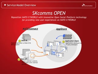 AppStore is an open application platform where SK Communications shares application programming interfaces (APIs), third-party developers provide applications, and users can add and use applications. The AppStore allows developers to register and develop applications using OpenSocial APIs and SK Communications' customized APIs. Registered applications will be available for users to add to their Minihompy profiles and interact with applications through social features like notifications, recommendations, and sharing with friends. The AppStore is aimed to provide a new user experience on NATE/CYWORLD through an innovative open social platform.