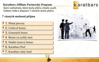 K základním druhůmpříjmu jako jsou přímá provize, Unilevel bonus, Generační bonus, Karatbars pool a Karatbars zlatý fond můžete zvýšit svůj příjem díky Dual Team Bonusu a Package Bonusu.