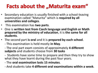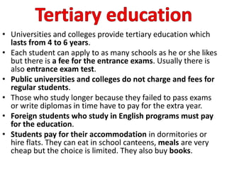 - Students can continue to universities or colleges after secondary school to obtain bachelor's, master's or doctoral degrees. The oldest university is Charles University in Prague.