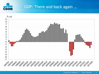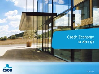 The document is an economic report on the Czech Republic from the third quarter of 2013. It analyzes key indicators of the Czech economy such as GDP, industrial output, construction, retail sales, unemployment, trade, inflation, interest rates, and currency exchange rates. The report finds that while the Czech economy recovered in 2013 after declining previously, growth remained modest and inflation was still elevated compared to the central bank's target. Unemployment levels differed across regions of the country.