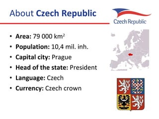 The Czech Republic, with an area of 79,000 km² and a population of 10.4 million, was formed from the historical region of Bohemia and became independent in 1993. Its capital, Prague, is a cultural and economic hub, attracting 4.1 million international visitors annually, with a UNESCO-listed historic center. It operates as a parliamentary republic, with the president serving as a ceremonial head of state and a prime minister holding significant executive power.