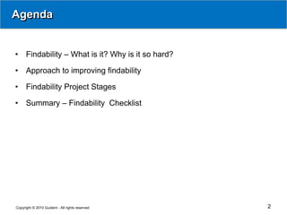 The document discusses the concept of 'findability' in the context of information retrieval within organizations and outlines the complex challenges involved in locating information. It emphasizes the importance of a comprehensive, holistic approach that incorporates technology, processes, and people to enhance document discoverability. Additionally, the document provides guidelines for improving findability through project stages and governance, ultimately advocating for continuous improvement and user engagement.