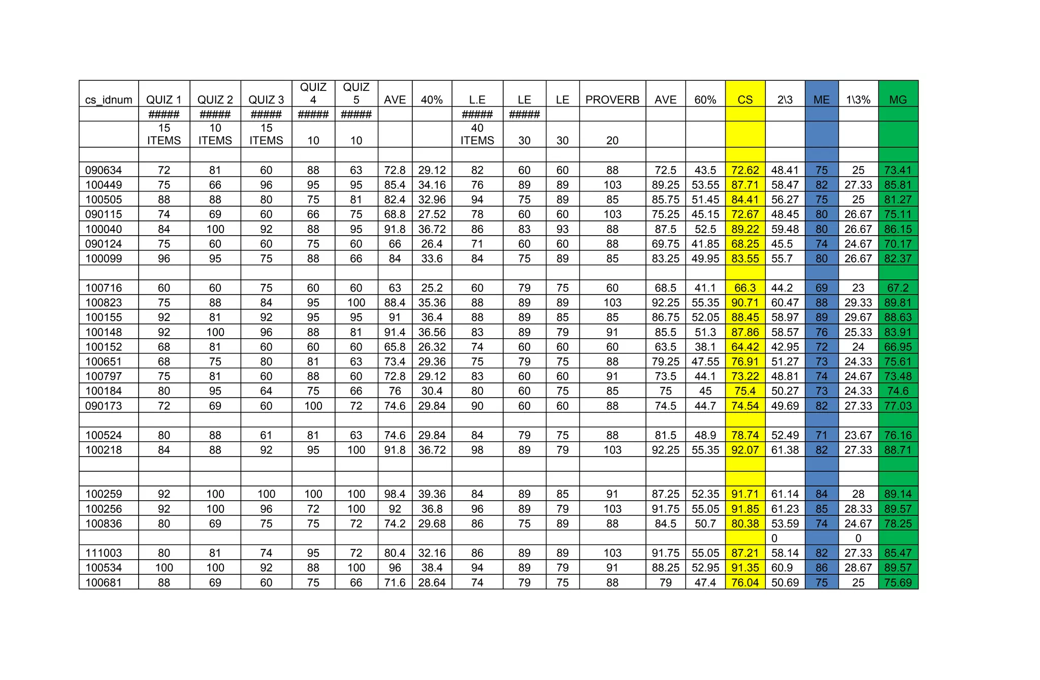- Student IDs and scores on 5 quizzes/exams labeled 1-5