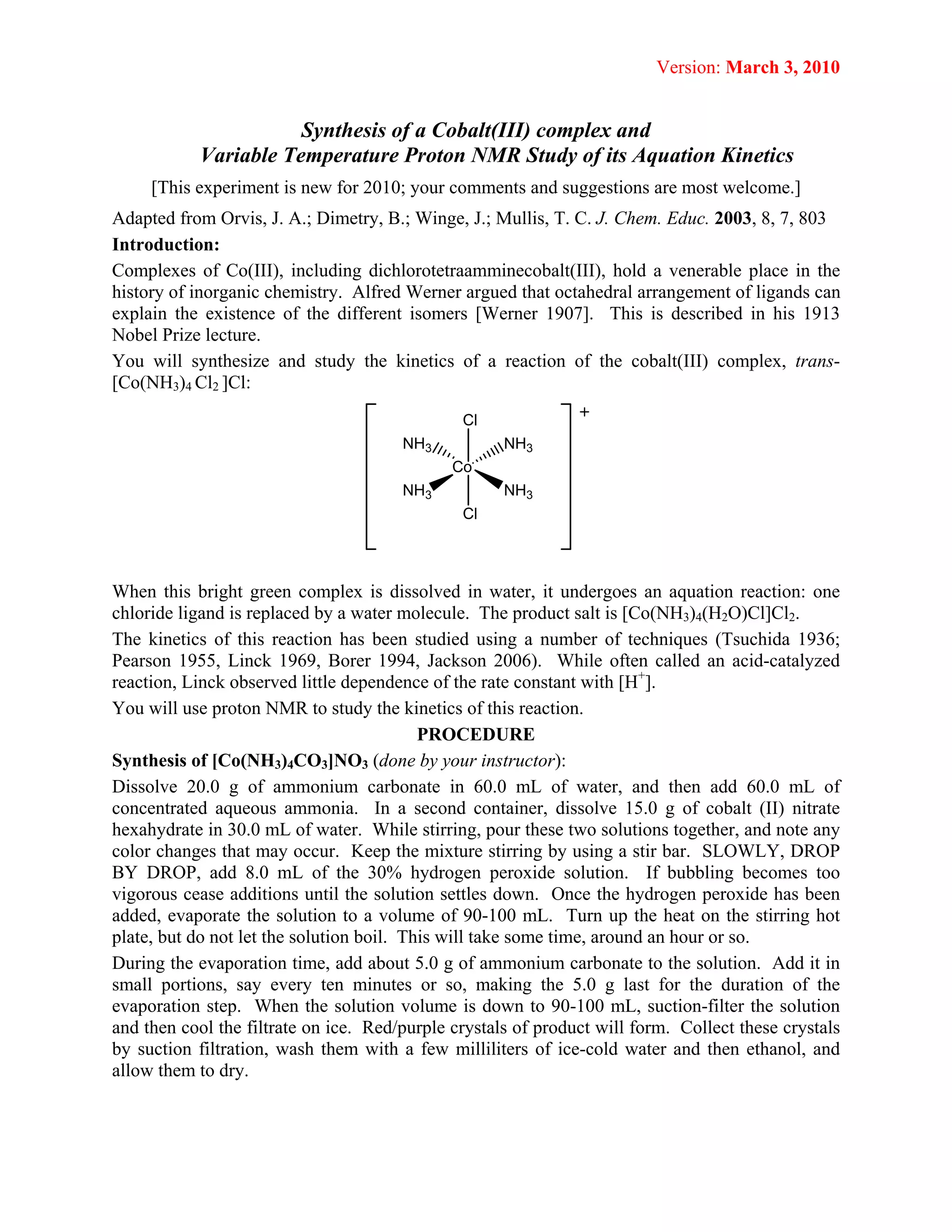 This document describes an experiment using proton NMR spectroscopy to study the aquation kinetics of trans-dichlorotetraamminecobalt(III) chloride. The reaction involves one chloride ligand being replaced by a water molecule. Kinetic analysis of NMR peak heights and integrals over time indicates the reaction is first-order. Arrhenius and Eyring parameters are determined and used to calculate the rate constant at 25°C, which agrees with literature values. The positive entropy of activation suggests an associative mechanism for this substitution reaction.