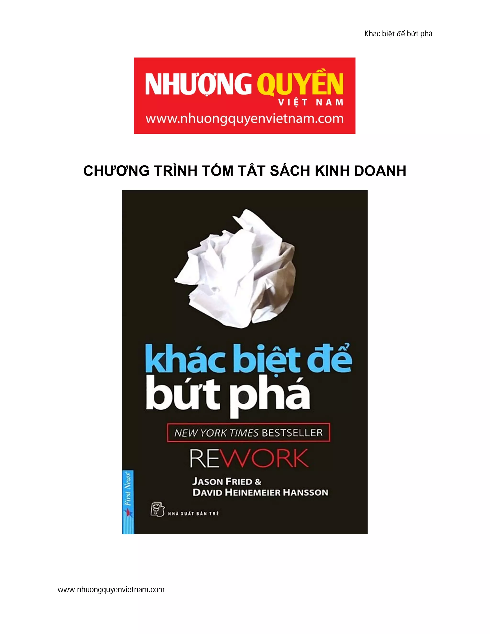 Cuốn sách "Khác Biệt Để Bứt Phá" của Jason Fried và David Heinemeier Hanson cung cấp một lối tiếp cận sáng tạo và thực tiễn để khởi nghiệp và thành công trong kinh doanh. Nó nhấn mạnh tầm quan trọng của việc học từ sự thành công, thực hiện những ý tưởng của chính mình, và phát triển một cách từ từ thay vì chạy theo sự mở rộng bộc phát. Các tác giả cũng lập luận rằng việc làm việc hiệu quả không nhất thiết phải cần nhiều thời gian hay nguồn lực, mà là đến từ sự tập trung và quyết tâm.