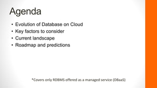 The document discusses the evolution and current landscape of cloud databases, focusing primarily on managed relational database services (DBaaS). It outlines key factors to consider when choosing a cloud database, including database container types, compatibility, purchasing options, license mobility, and hybrid integration. The top cloud database providers highlighted are Amazon RDS, Google Cloud SQL, Microsoft Azure SQL Database, and Rackspace Cloud SQL, each with their strengths and weaknesses.