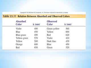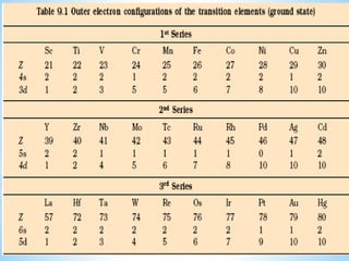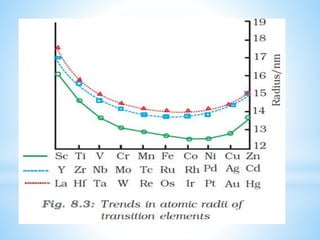3) General properties of d-block elements include high melting/boiling points due to strong metallic bonds, variable oxidation states, and many forming colored ions or complexes.