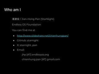 The document provides an introduction to D-Bus, a message bus system for inter-process communication (IPC) in Unix-like systems. It covers aspects such as implementation methods, resource addressing, data and message types, and debugging tools for creating D-Bus applications. Additionally, it discusses the architecture of D-Bus, its usage in various environments, and examples of D-Bus communication methods and standard interfaces.
