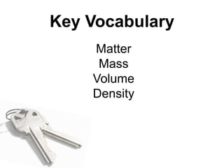 This document defines key vocabulary related to matter including matter, mass, volume, and density. It explains that matter is anything that has mass and takes up space, existing as solids, liquids, or gases. Mass refers to how much matter makes up an object, while volume is the amount of space an object takes up. Density measures how heavy or light an object is compared to its volume. Laboratory tools like balances and cylinders are used to measure mass and volume. The document reviews that matter is defined as anything having mass and volume.