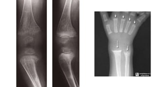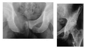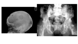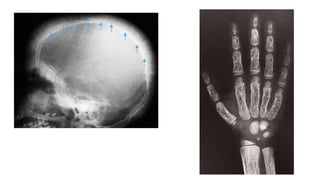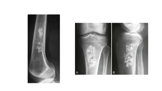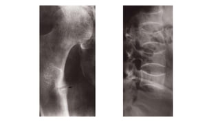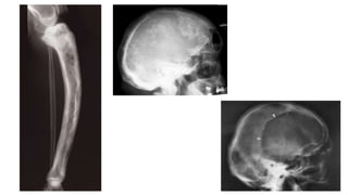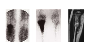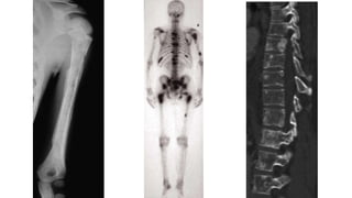 This document summarizes various bone imaging techniques and bone pathologies that can be identified on imaging. It discusses radiological techniques for bone imaging including their advantages and disadvantages. It also provides details on identifying characteristics of primary bone tumors like osteosarcoma and chondrosarcoma, metastatic bone lesions, and benign bone conditions including osteoid osteoma, fibrous dysplasia, and aneurysmal bone cyst on imaging studies. Common causes of generalized bone abnormalities such as osteoporosis, rickets/osteomalacia, hyperparathyroidism, and renal osteodystrophy are also summarized.