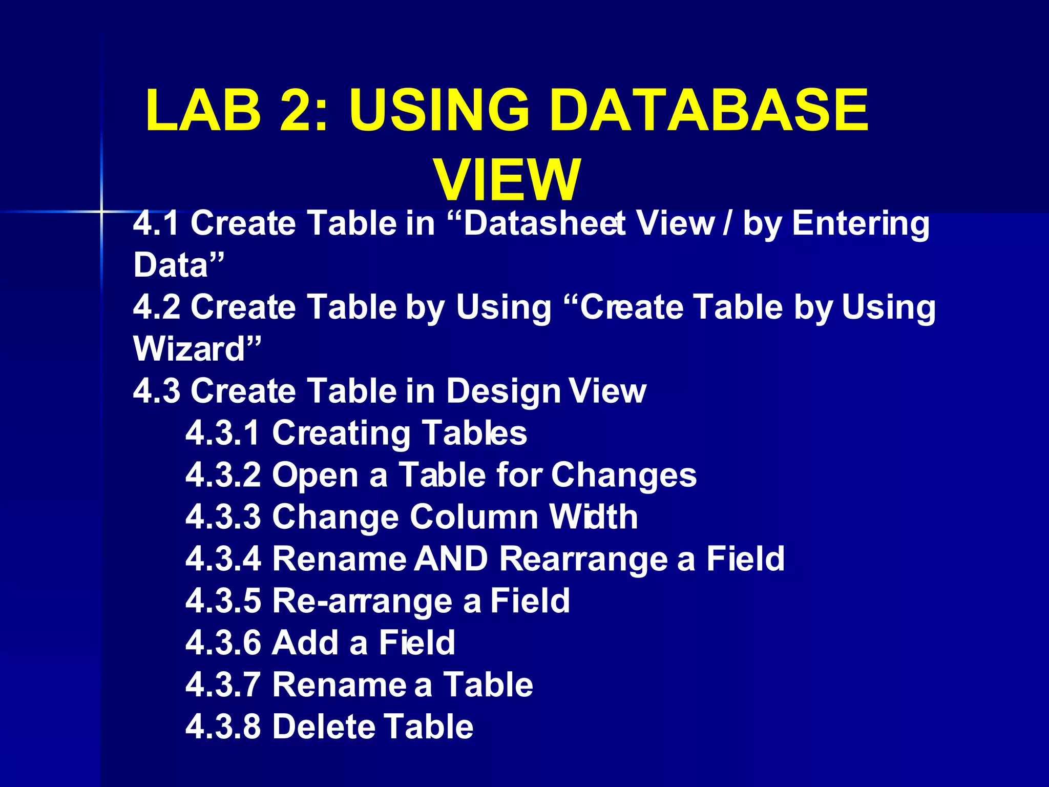 The document discusses how to create and modify tables in a database using different methods in Microsoft Access. It explains how to create a table in datsheet view, using the table wizard, and in design view. It also describes how to change field names and properties, enter data, and perform other common table editing tasks. The lab activity involves creating a library database with tables for authors, books, book-author relationships, and publishers.
