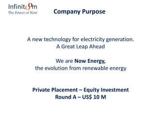 This document summarizes an investment opportunity in Now Energy, a company developing a new electricity generation technology called Infinitoom. Now Energy is seeking a $10 million Series A investment that would acquire 10% equity. The technology uses a novel double suspension double flux design to generate electricity without fossil fuels, fuel supply contracts, or contaminating air and water. It can provide clean, reliable distributed electricity generation that is movable and does not require wind, sun, or large land areas. The investment would support engineering, manufacturing, marketing, and initial project development and sales.