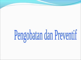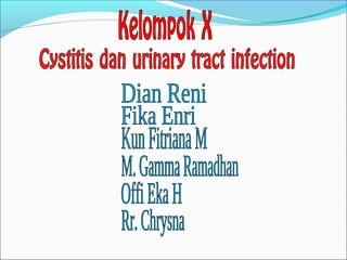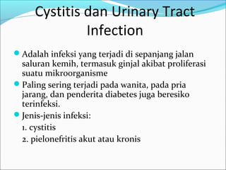 Dokumen tersebut membahas tentang infeksi saluran kemih dan cystitis, termasuk gejala, penyebab, diagnosis, dan pengobatan. Jenis infeksi saluran kemih antara lain cystitis dan pielonefritis, yang disebabkan bakteri seperti E. coli. Diagnosis didasarkan pada pemeriksaan urin dan biakan bakteri. Pengobatan dilakukan dengan antibiotik oral atau parenteral seperti sulfonamida, trimetoprim, dan aminglikosida.