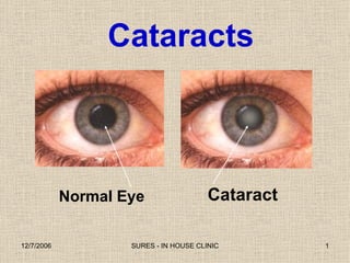 A cataract is a clouding of the lens in the eye that leads to a decrease in vision. It develops when the protein in the lens clumps together, blocking light from reaching the retina. The four main types are age-related, congenital, secondary, and traumatic. Symptoms include blurry or foggy vision, sensitivity to light, and frequent changes in prescription glasses. Treatment options range from eyeglasses to surgical removal of the clouded lens and replacement with an artificial lens. Cataract surgery is highly effective but does carry risks of complications.