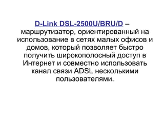 D-Link DSL-2500U/BRU/D — маршрутизатор для малых офисов и домашних пользователей, обеспечивающий доступ в интернет через ADSL и имеющий один ADSL и один LAN порт. Устройство поддерживает различные стандарты ADSL и ADSL2, а также включает функции управления трафиком и безопасности, такие как межсетевой экран и фильтрация пакетов. Работает в температурном диапазоне от 0°C до 40°C и поддерживает различные протоколы для настройки и управления устройством.