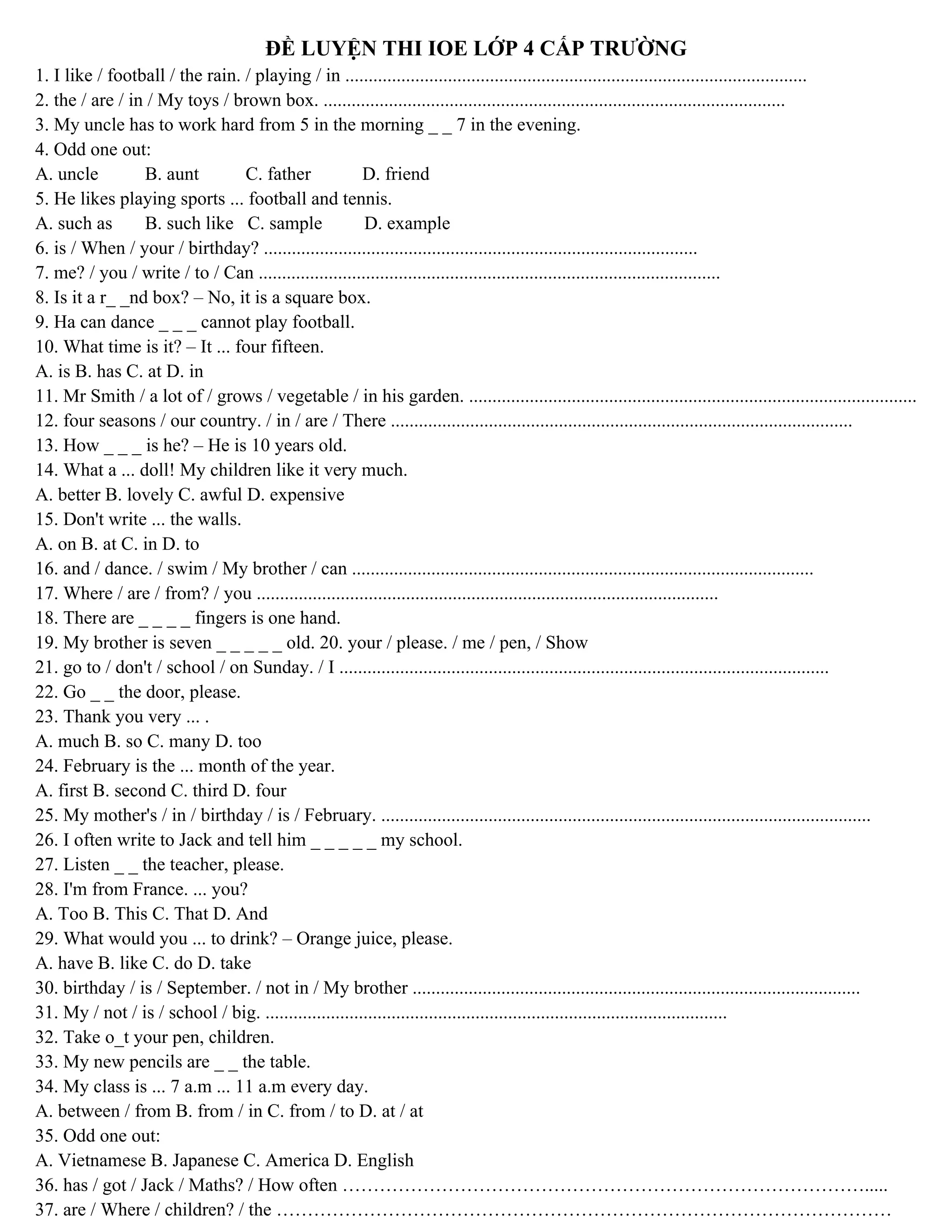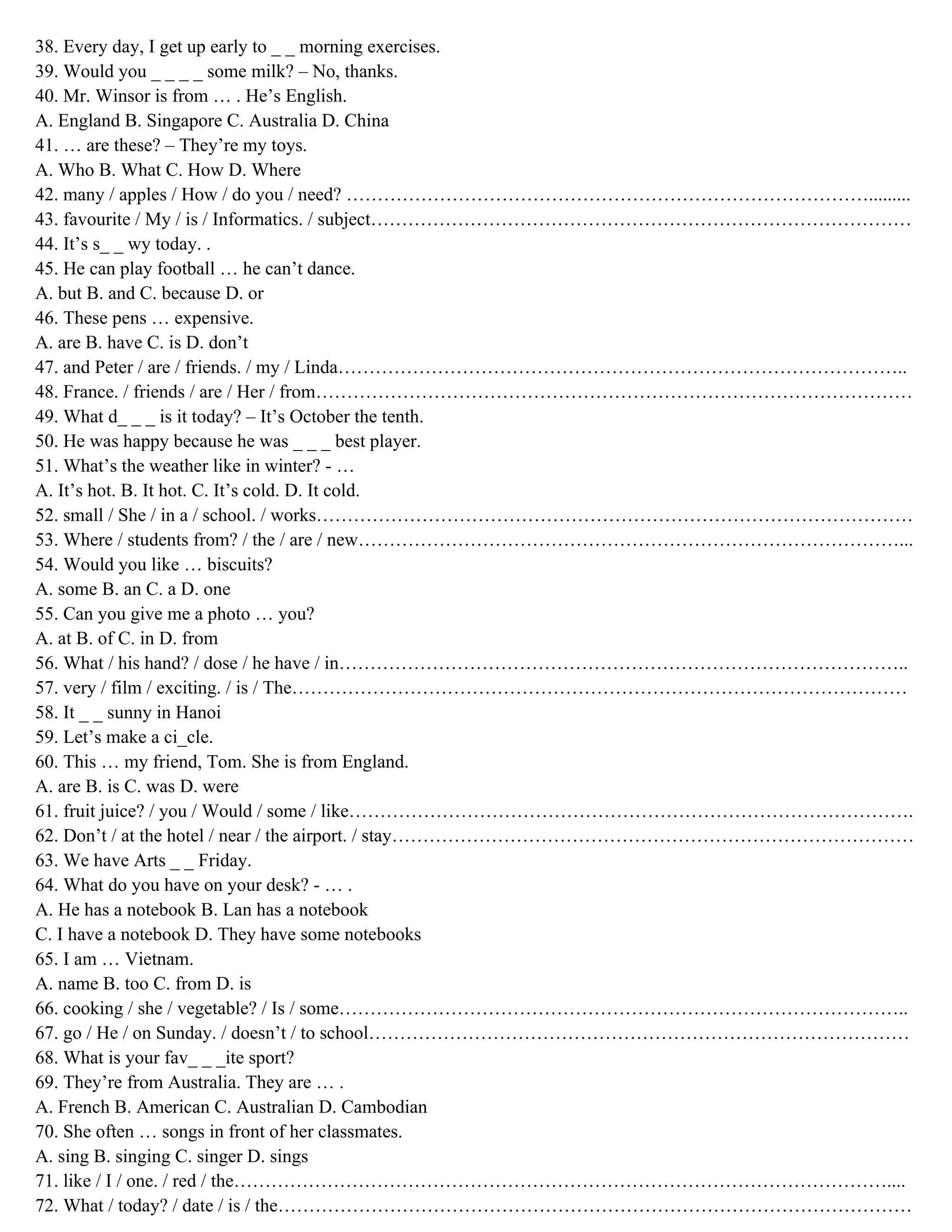 The document consists of a collection of exercises intended for 4th-grade students to help them prepare for an English exam. It includes a variety of tasks such as sentence completion, multiple-choice questions, and vocabulary exercises covering grammar, spelling, and comprehension. Each question focuses on basic English language skills, making it suitable for young learners.