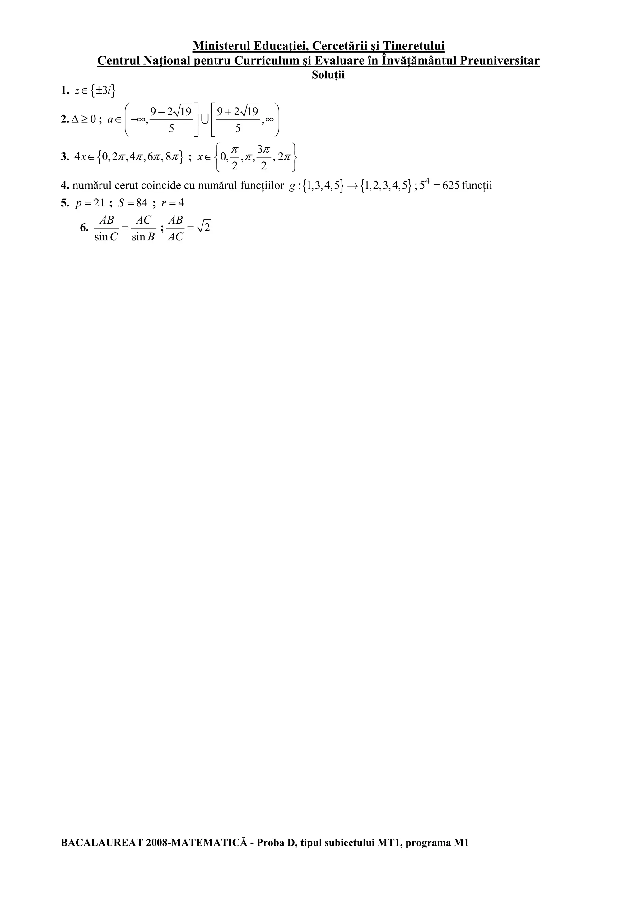 Documentul se referă la proba de matematică din cadrul bacalaureatului de anul 2008, inclusiv problema cu cerințe specifice despre funcții și trigonometrică. Conține exemple de tipuri de subiecte și soluții corespunzătoare pentru diverse exerciții. De asemenea, se menționează anumite condiții și relații între variabile.