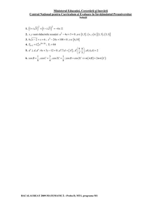 Documentul conține exerciții și ecuații din cadrul unei programe de matematică pentru examenul de bacalaureat 2009. Se prezintă soluții pentru diferite ecuații și relații trigonometrice. Informațiile sunt structurate în forma unor probleme matematice specifice curriculumului național.