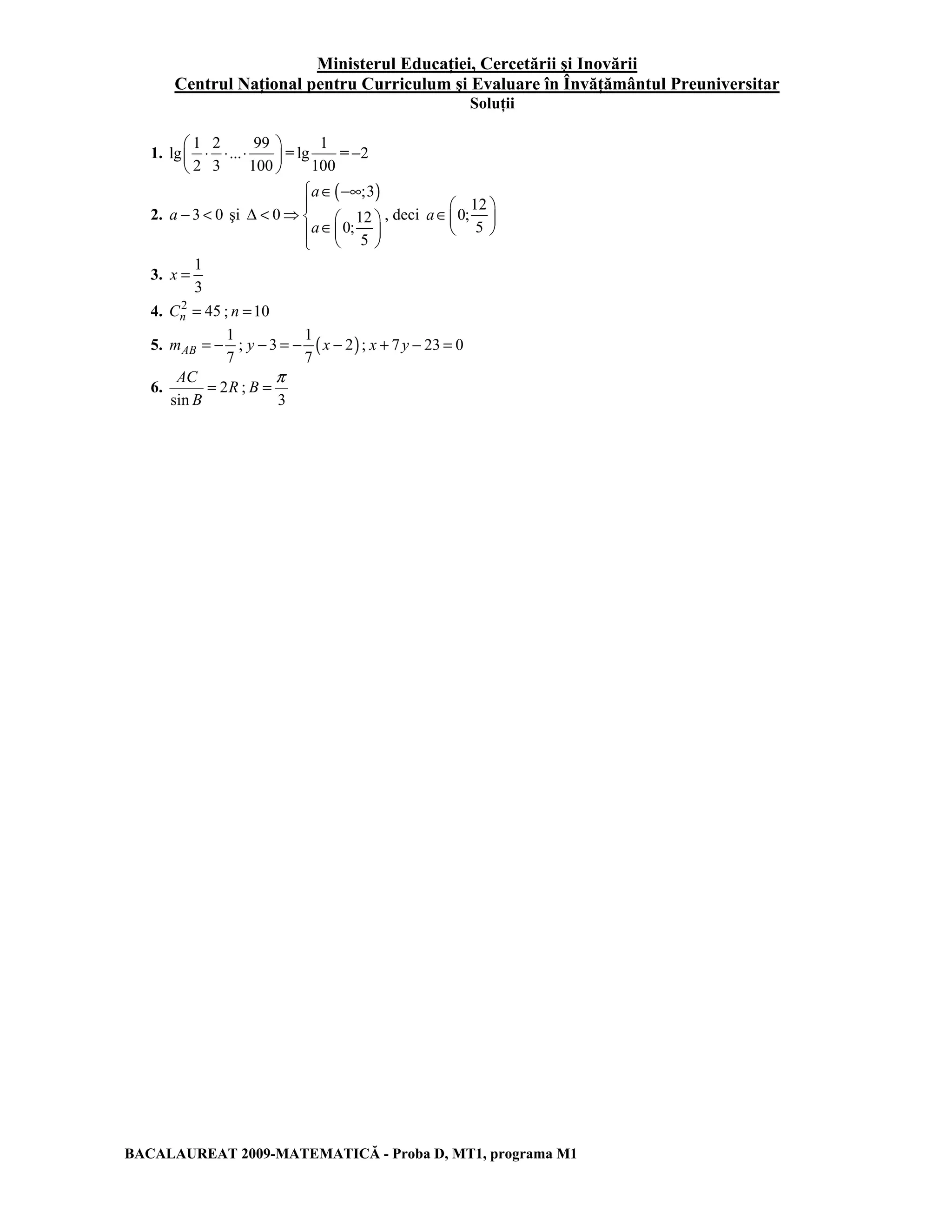 Documentul se referă la un set de soluții pentru exerciții din cadrul examenului de bacalaureat la matematică din 2009. Acesta include probleme de matematică diverse, cum ar fi ecuații, inegalități și funcții. Soluțiile sunt prezentate într-un format tehnic specific educației preuniversitare.