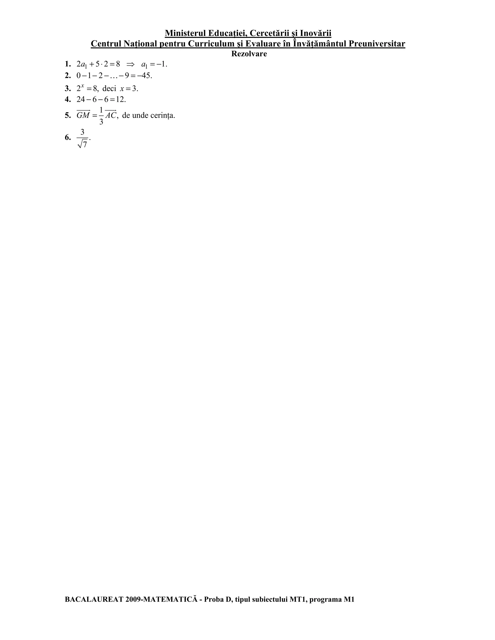 Documentul se referă la un set de exerciții de matematică din programa de bacalaureat 2009 pentru proba D. Acesta include soluții pentru diverse ecuații și probleme matematice. Informațiile sunt relevante pentru evaluarea cunoștințelor din domeniul matematic.