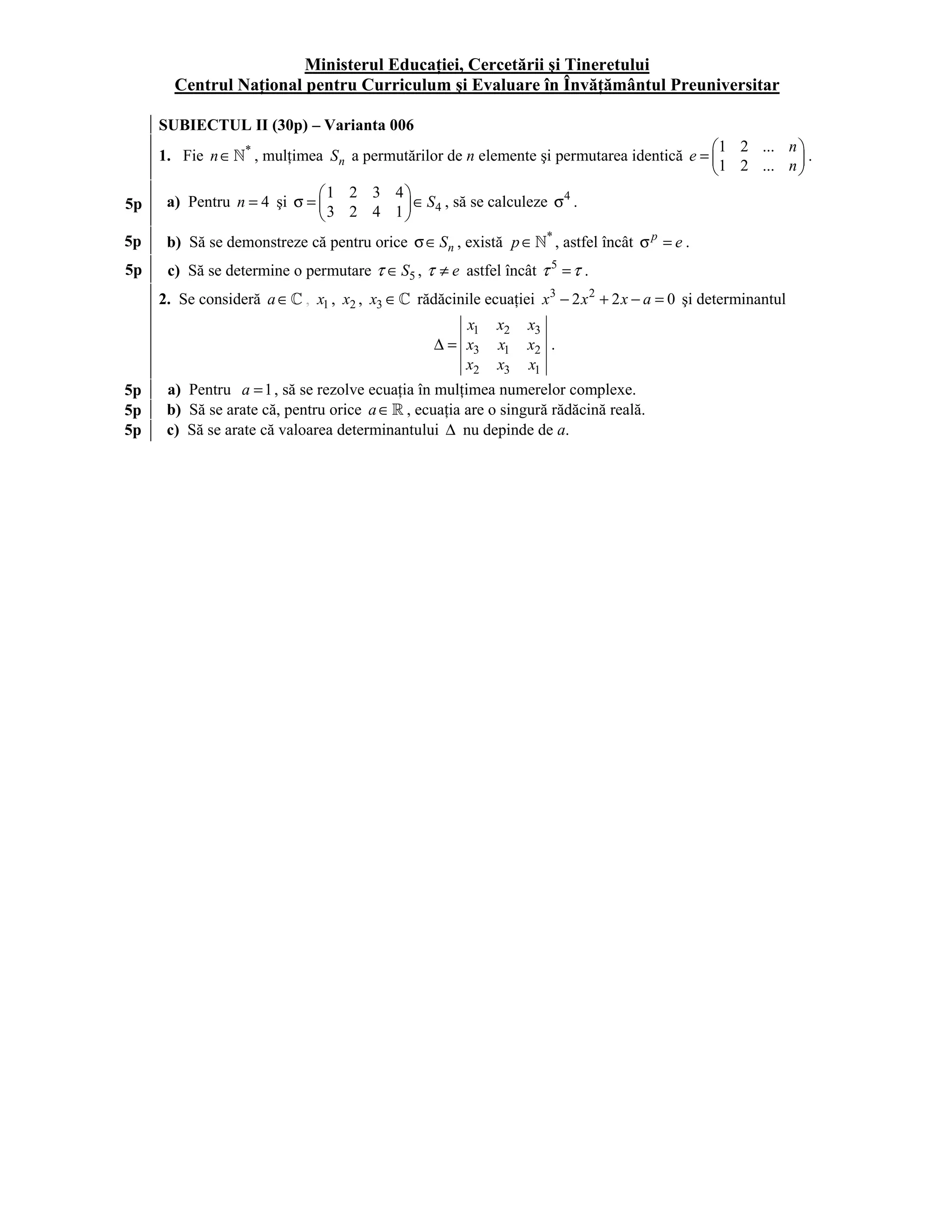Documentul abordează teme de matematică avansată, inclusiv permutări și ecuații polinomiale. Se discută permutarea identică și se propun exerciții pentru calcularea și demonstrerea proprietăților permutărilor. De asemenea, documentul analizează un polinom cubic și determinanți, evidențiind soluțiile și caracteristicile acestora.