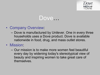 The document discusses Dove's new line of men's personal care products. It provides an overview of the Dove brand and its mission of expanding perceptions of beauty. The new Dove Men+Care line includes soaps, deodorants, body washes, and shaving products. The communication for Dove Men aims to promote the concept of feeling comfortable in one's own skin, similar to previous Dove campaigns. However, the messaging may need modification to clearly explain the benefits men will receive from Dove products. Suggestions are provided for improving the online marketing strategy to better target the male audience.