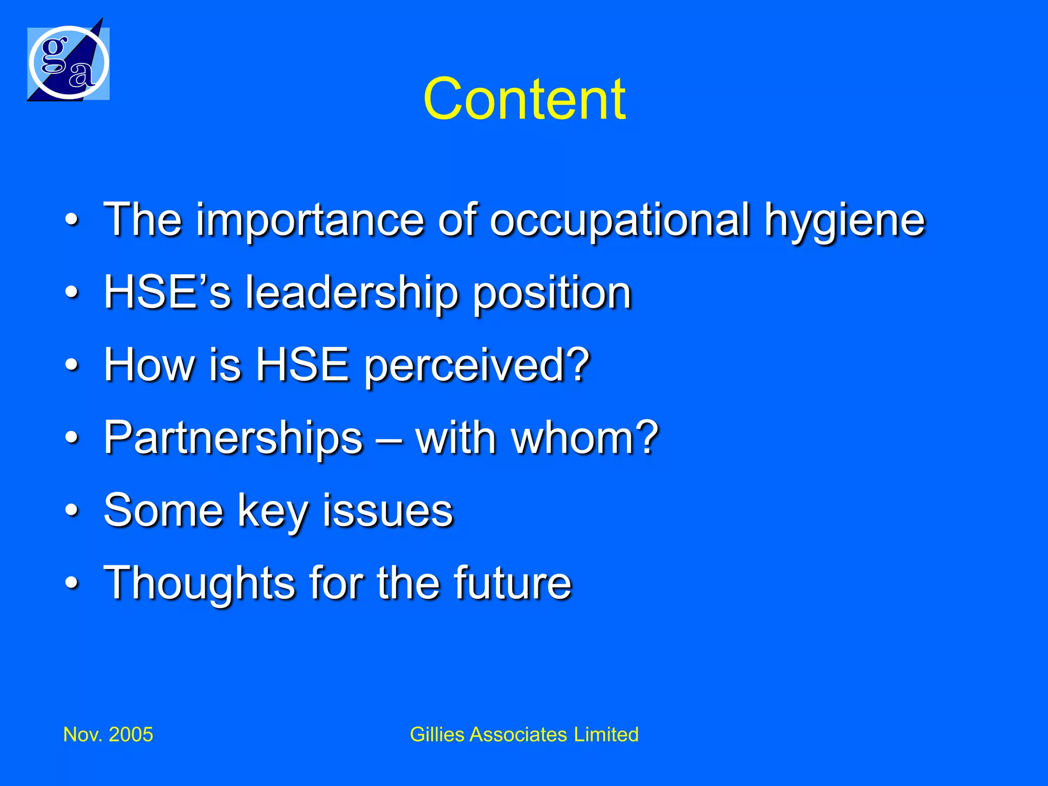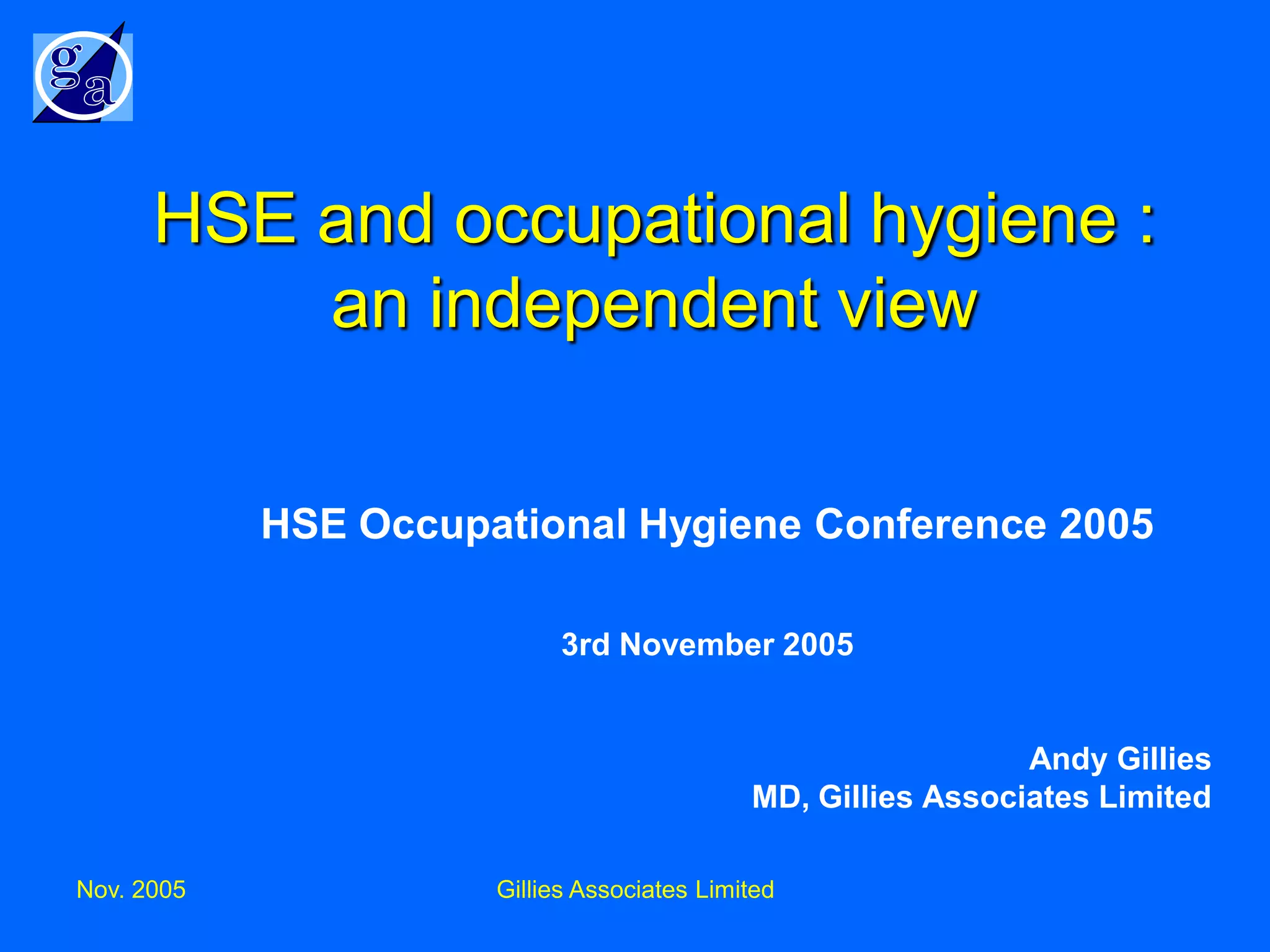 The document discusses a presentation given by Andy Gillies at the 2005 HSE Occupational Hygiene Conference. The presentation covers the importance of occupational hygiene, HSE's leadership position in promoting occupational hygiene in the UK, and how industry perceives HSE. It also identifies some key issues for occupational hygiene like emerging risks and challenges working with small and medium enterprises, and discusses barriers to implementing good control practice. The presentation concludes by looking at new challenges for the future of occupational health.