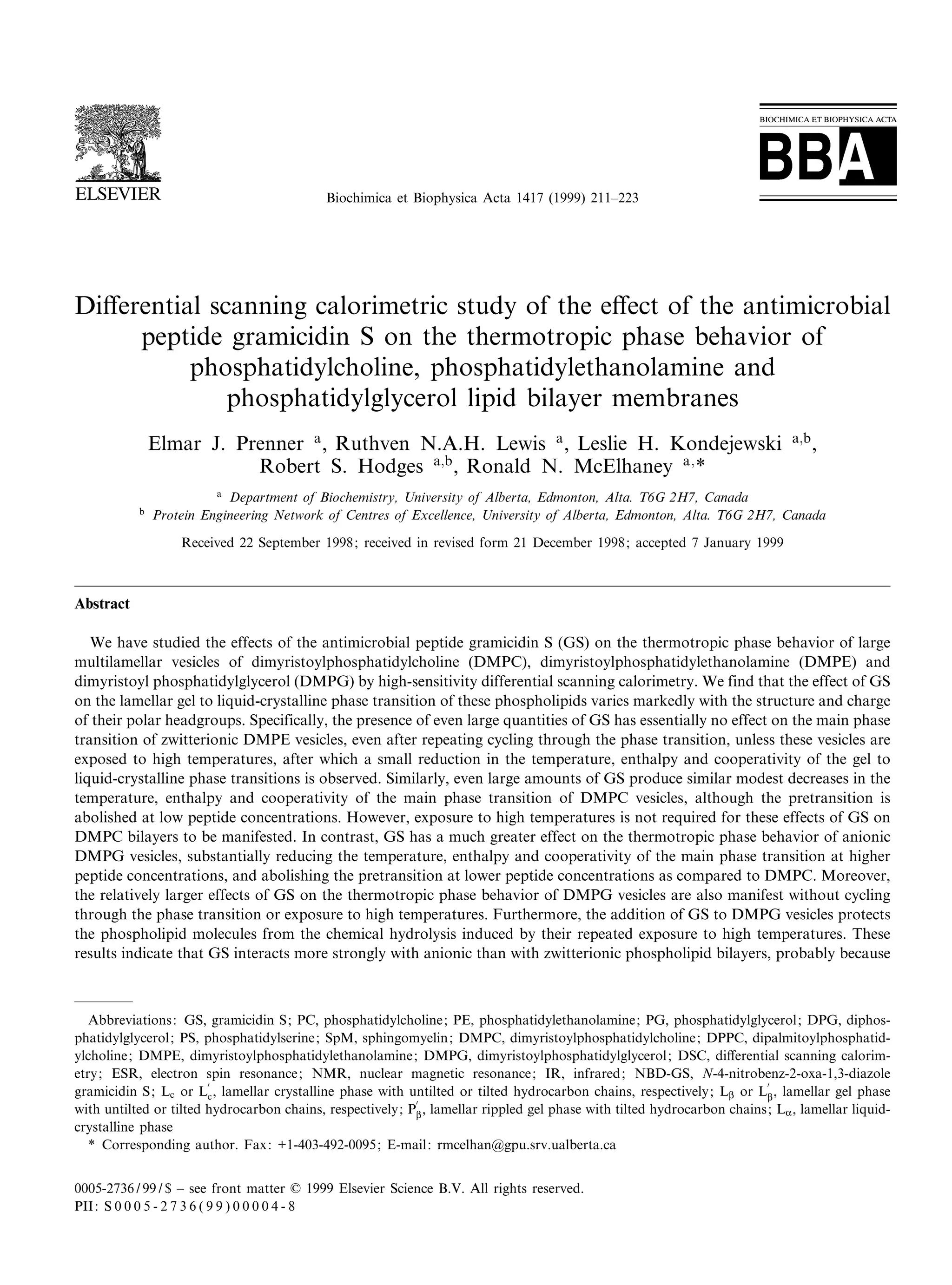 This study examines the effect of the antimicrobial peptide gramicidin S (GS) on the thermotropic phase behavior of lipid bilayer membranes composed of dimyristoylphosphatidylcholine (DMPC), dimyristoylphosphatidylethanolamine (DMPE), and dimyristoylphosphatidylglycerol (DMPG) using differential scanning calorimetry. The results show that GS interacts more strongly with anionic DMPG bilayers than with zwitterionic DMPC or DMPE bilayers, reducing the temperature and cooperativity of DMPG's phase transition to a greater degree. In contrast, GS has little effect on DMP