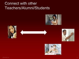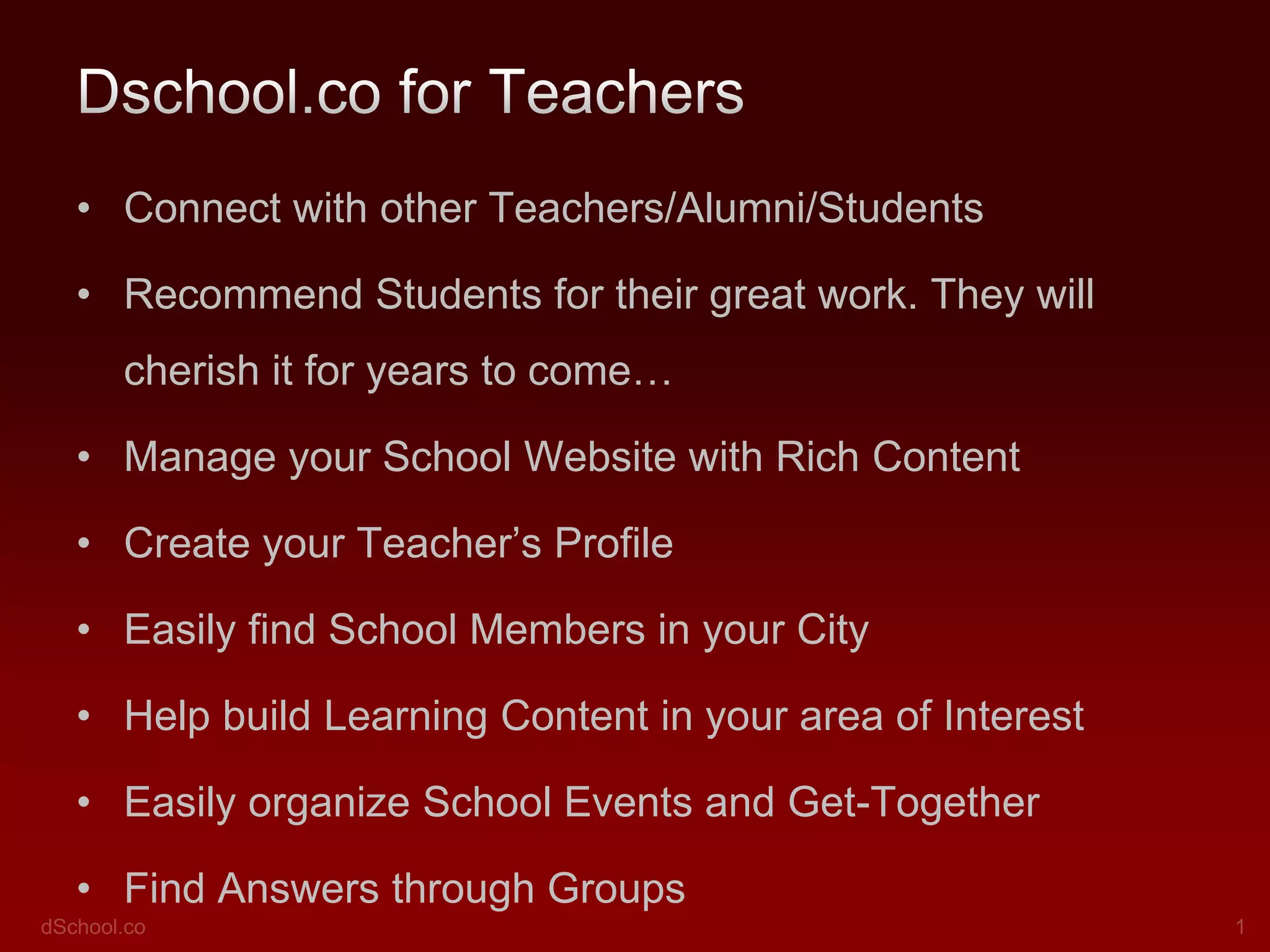 Dschool.co is a website for teachers to connect with other teachers, alumni and students, create groups in their areas of interest, and recommend students. It allows teachers to manage their school website with rich content like videos and images, build learning content, and easily organize school events through surveys, invites, and group discussions. The site provides a profile page for teachers and tools for summer camps and connecting over shared interests in topics like machine learning and problem solving.