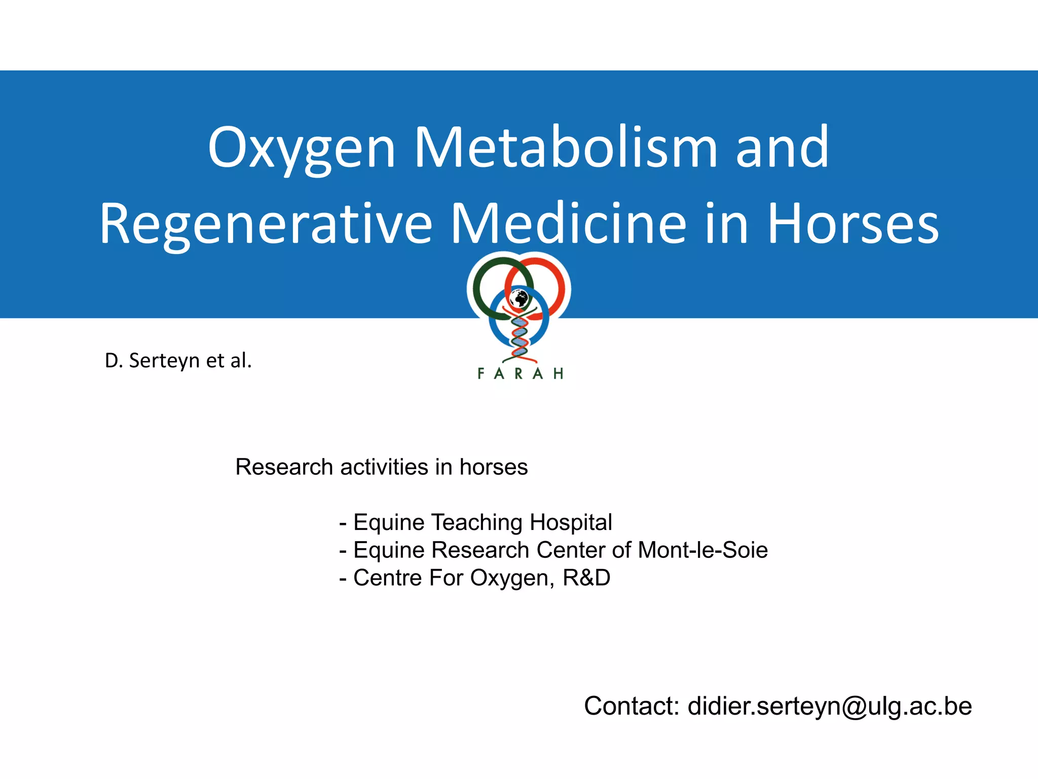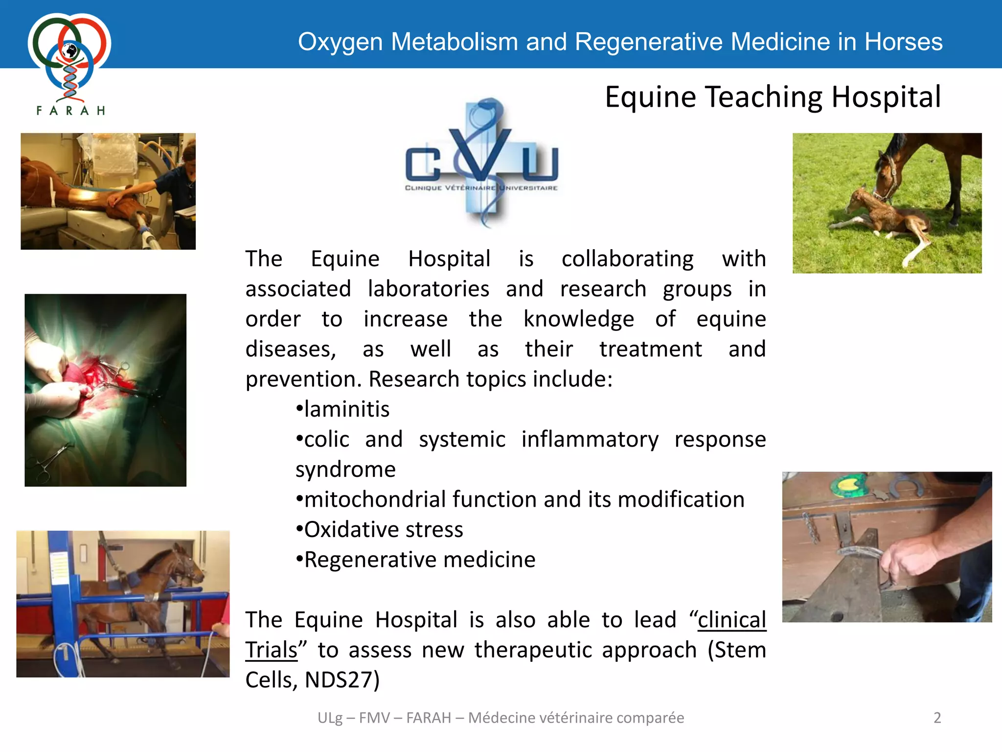 This document discusses research activities related to oxygen metabolism and regenerative medicine in horses being conducted by the Equine Teaching Hospital, Equine Research Center of Mont-le-Soie, and Centre For Oxygen, R&D at the University of Liege in Belgium. The research topics include laminitis, colic, mitochondrial function, oxidative stress, and regenerative medicine using stem cells and other therapies. The groups are conducting clinical trials and research on conditions such as developmental orthopaedic disease, tendinopathy, arthropathy, and muscle disorders using equipment like a treadmill, gait analyzer, and oxygen consumption monitors. Patents have been filed for stem cell therapies, anti-inflammatory drugs, and diagnostic tools.