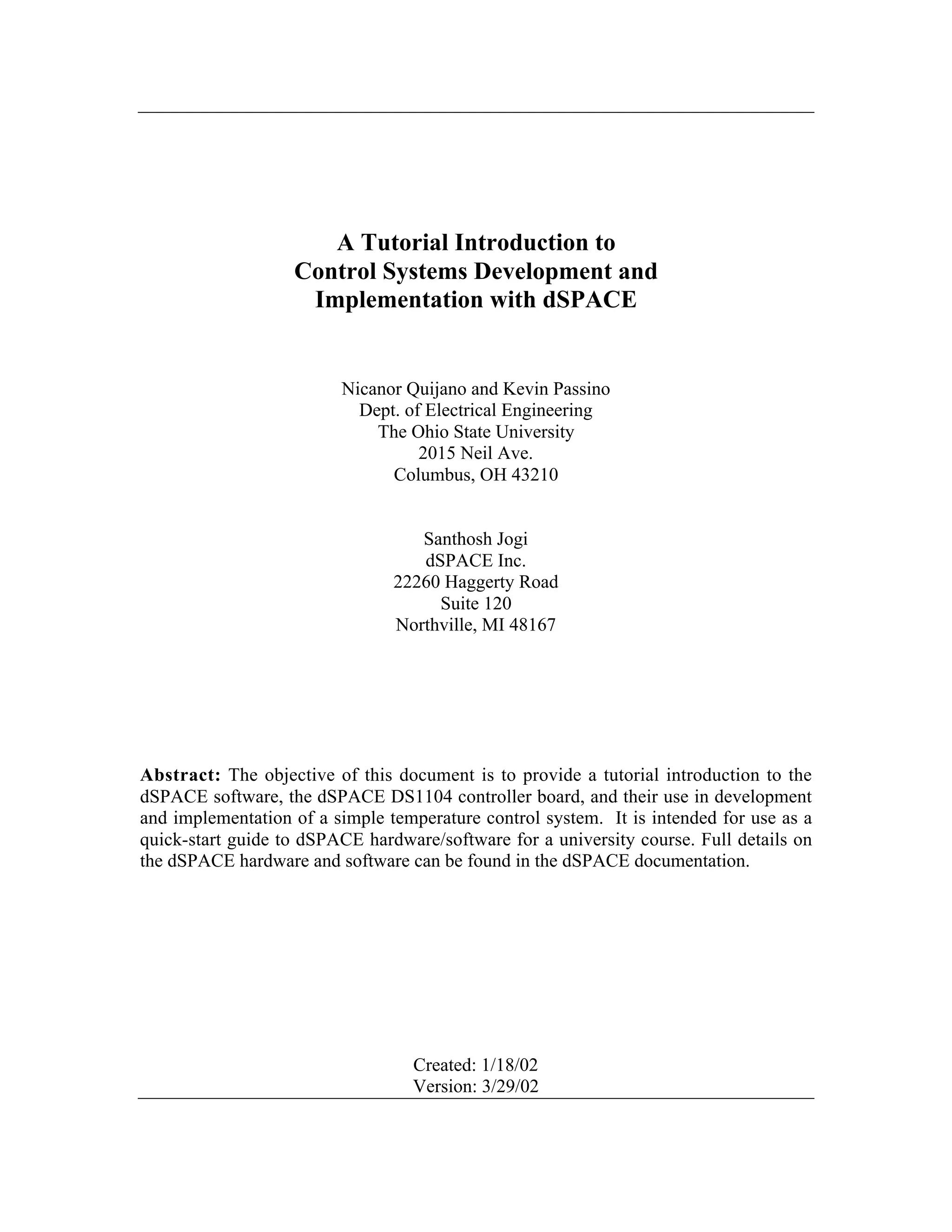 This document provides a tutorial introduction to using the dSPACE software and DS1104 controller board to develop and implement a simple temperature control system. It describes connecting a temperature sensor and lamp to the DS1104 board for the control problem. It then explains how to create a new experiment in ControlDesk, develop a controller model in Simulink, and interface the model to the physical system using analog to digital and digital to analog conversion blocks. Specifically, it covers configuring the ADC block to read the sensor voltage on channel 5 and scaling the input range, and provides an example temperature to voltage mapping for the sensor.