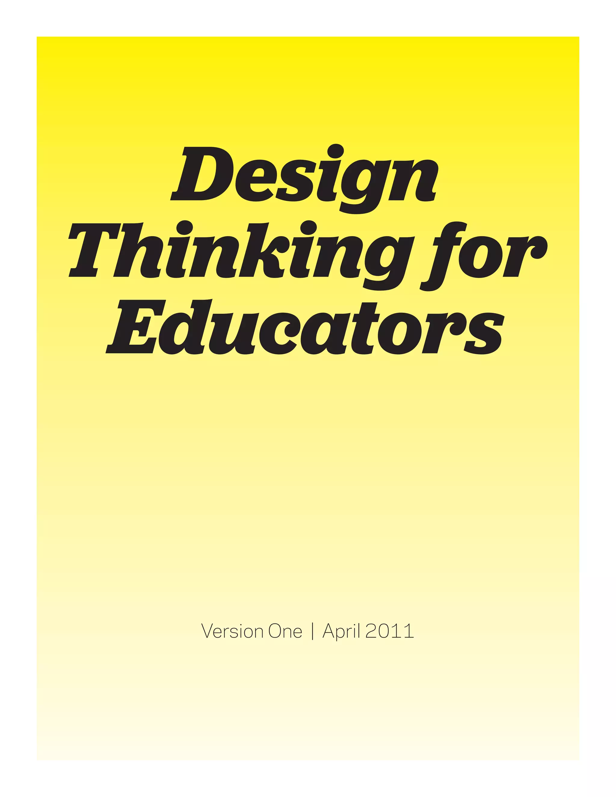 This document introduces design thinking as a process that can help educators address challenges in new ways. It discusses the five phases of the design process - discovery, interpretation, ideation, experimentation, and evolution - which help move from identifying a problem to developing a solution. The process combines concrete problem solving with more abstract thinking, using techniques like observation, brainstorming, prototyping, and getting feedback from others. It is presented as a structured approach that applies skills educators already use in a new context to generate innovative ideas.