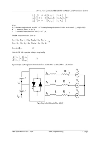 This document summarizes a study on using STATCOM and UPFC devices to control power flow in a distribution system. It presents the mathematical models of STATCOM and UPFC, including their control design procedures. Simulation results show that STATCOM effectively regulates local reactive power load and UPFC controls real power flow by varying the phase angle of injected voltage. The study demonstrates how FACTS devices like STATCOM and UPFC can improve power flow control in distribution systems.