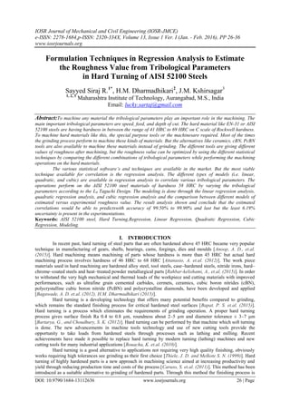 This document discusses a study that uses regression analysis techniques to estimate surface roughness values based on tribological parameters during hard turning of AISI 52100 steel. Experiments were conducted using a Taguchi L9 orthogonal array with cutting speed, feed rate, and depth of cut as parameters. Linear, quadratic, and cubic regression models were developed to correlate the parameters to surface roughness. The results showed that the estimated correlations predicted roughness with 99.5-99.9% accuracy, with only 6.19% uncertainty in the experiments.