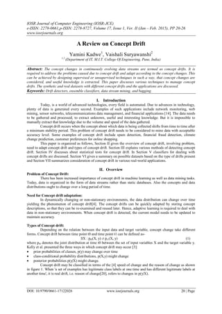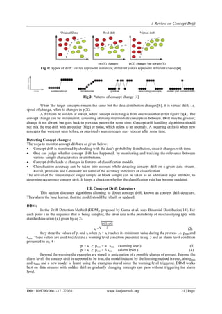 This document provides an overview of concept drift, which refers to changes in the underlying patterns or distributions of data over time. The main types of concept drift are discussed, including changes in class probabilities, class-conditional probabilities, and posterior probabilities. Several techniques for detecting concept drift are also summarized, such as the Drift Detection Method (DDM) and its modification EDDM, the ADWIN method using variable-sized windows, paired learners using stable and reactive models, and the ECDD method based on exponentially weighted moving averages. The document reviews these concept drift detection algorithms and their applications for adapting models to changing data streams.