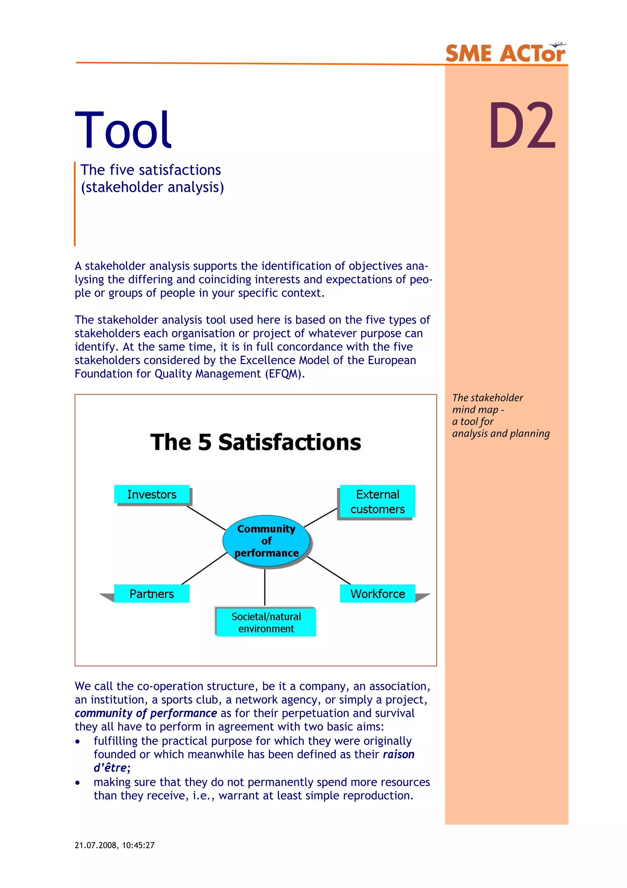 This document discusses stakeholder analysis and identifies five types of stakeholders for any organization: investors, customers, workforce, partners, and the societal and natural environment. It describes a process for analyzing stakeholders that involves identifying specific stakeholders, ranking them by importance, determining their expectations, and assessing how well the organization meets those expectations. The overall goal of the analysis is to satisfy stakeholders' needs.