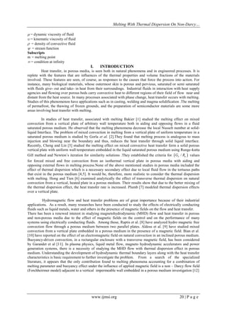 The document investigates non-Darcy magnetohydrodynamic (MHD) mixed convective heat transfer from a vertical plate in a saturated porous medium, focusing on the effects of melting, thermal dispersion, and inertia on velocity distribution and heat transfer rates. Utilizing numerical methods, the study finds that the Nusselt number decreases with increasing melting parameters and increases with thermal dispersion parameters. Results highlight the interplay between magnetic fields and flow characteristics, emphasizing thermal dispersion's role in enhancing heat transfer efficiency.