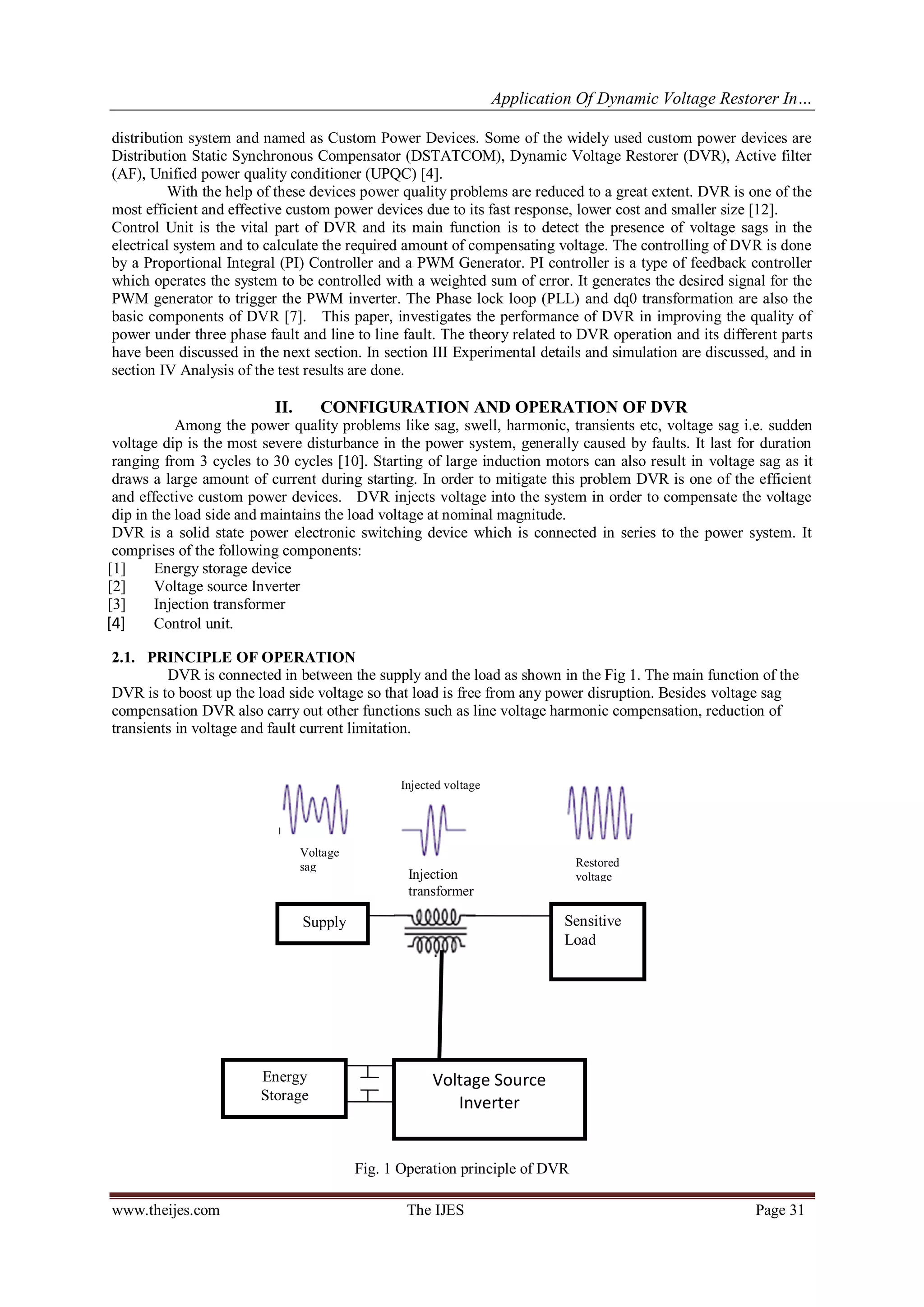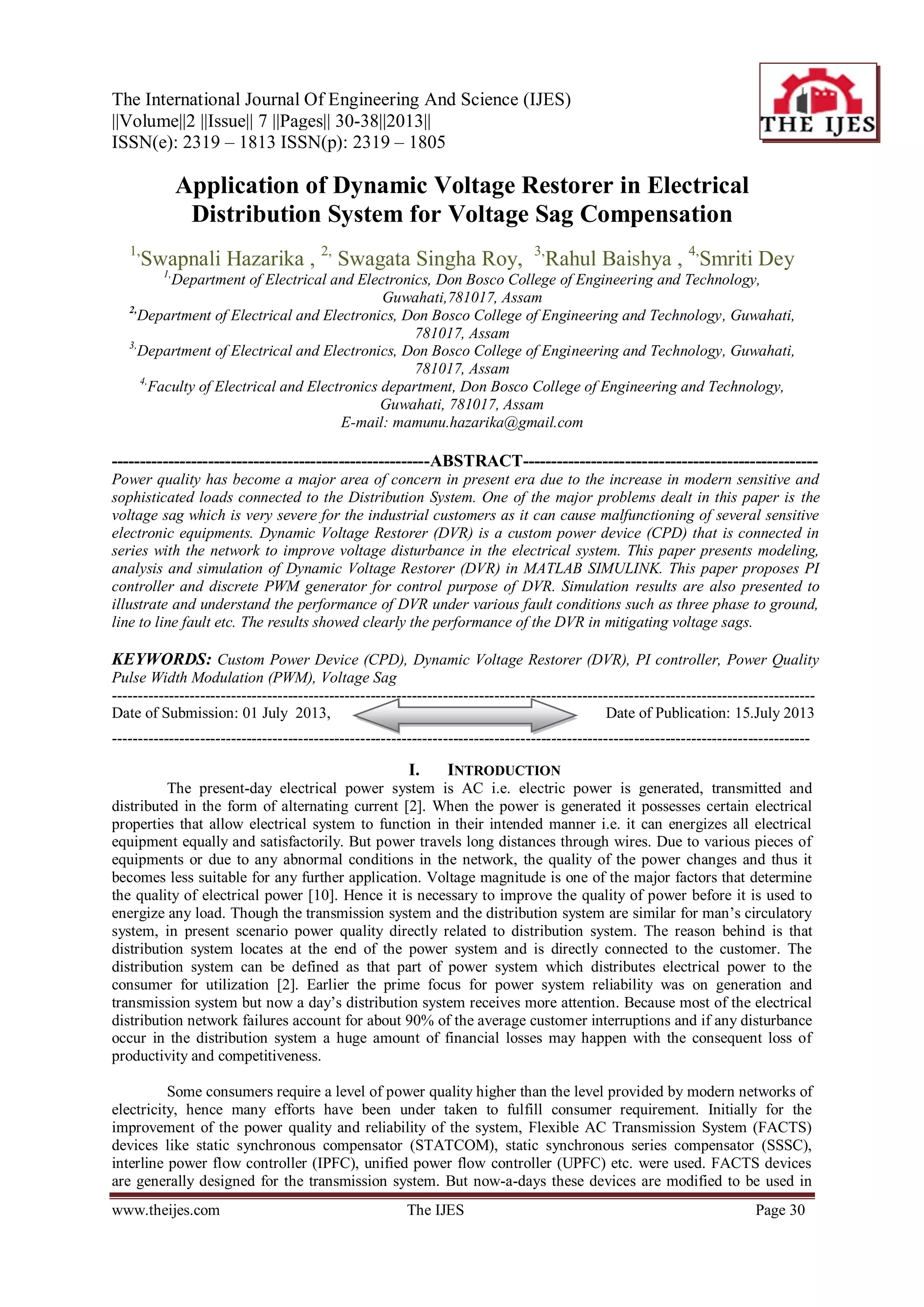 The document discusses a study on the application of Dynamic Voltage Restorer (DVR) in electrical distribution systems to compensate for voltage sags, which pose significant issues for industrial consumers. It presents modeling, analysis, and simulation results using MATLAB Simulink, demonstrating the effectiveness of DVR under various fault conditions, including three-phase and line-to-line faults. The study emphasizes the importance of enhancing power quality through custom power devices like DVR, which efficiently manages voltage disturbances and maintains nominal load voltage.