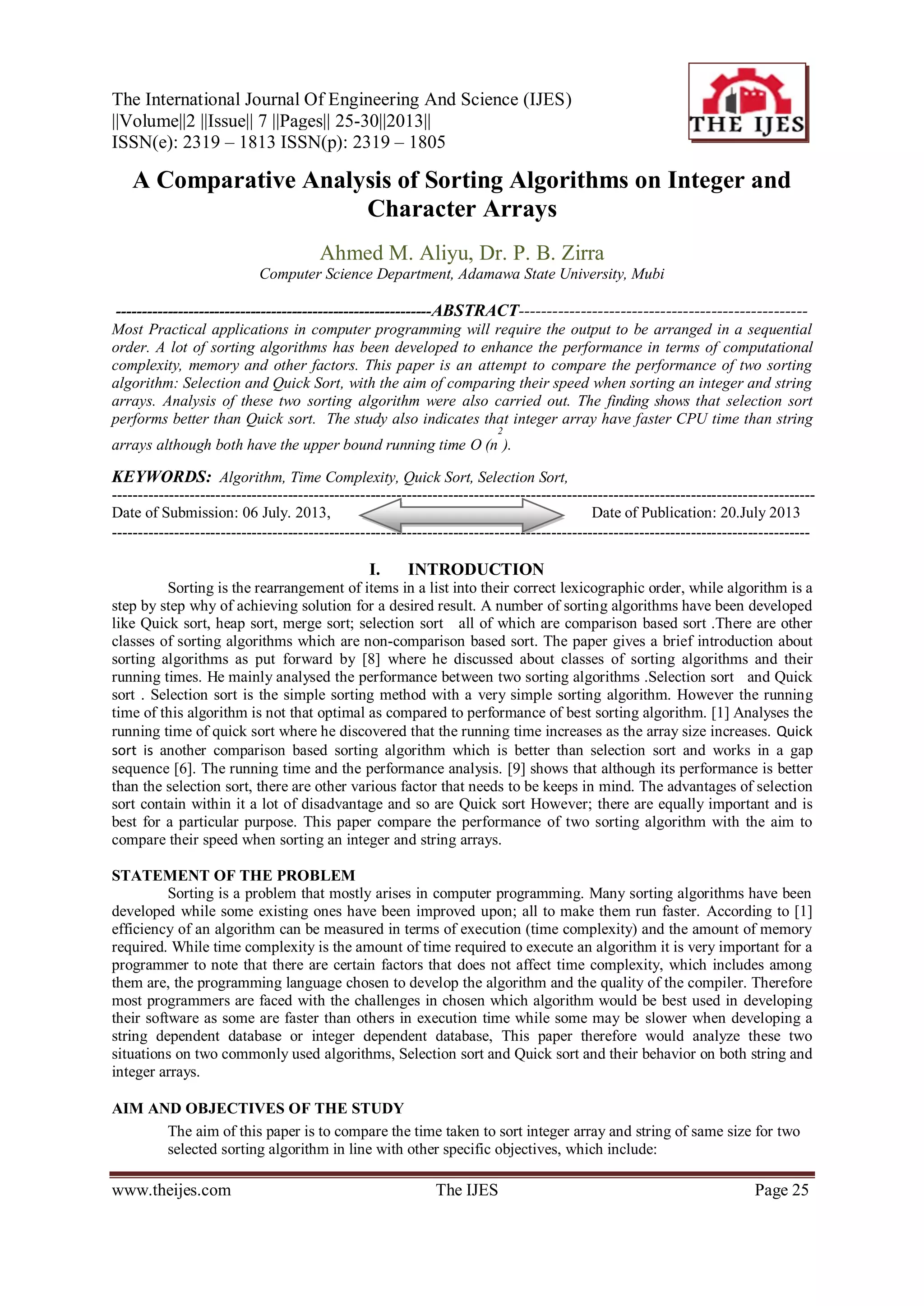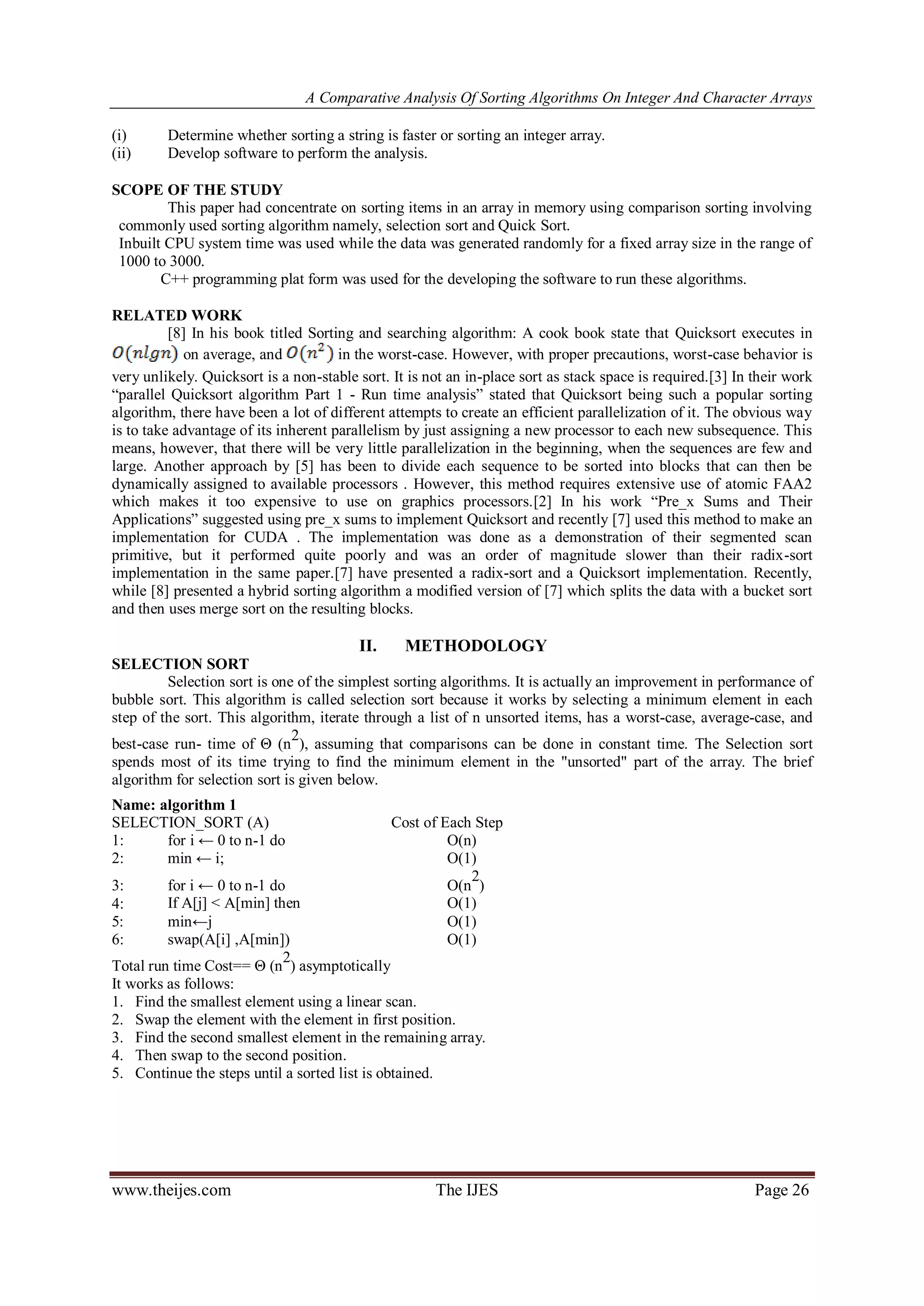 This paper compares the performance of two sorting algorithms, selection sort and quick sort, analyzing their execution time on integer and string arrays. Results indicate that selection sort outperforms quick sort in terms of speed, particularly for string arrays, although both algorithms exhibit a time complexity of O(n^2). The study concludes that while selection sort is simpler and more efficient for smaller data sets, both algorithms struggle with larger arrays.