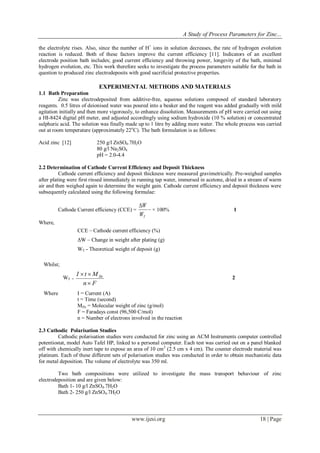 The document investigates the process parameters affecting zinc electrodeposition from a sulfate bath, focusing on cathode current efficiency and deposit thickness. Key findings include the impact of current density, bath temperature, and agitation on the deposition process, revealing that current efficiency and deposit thickness correlate inversely with agitation and directly with temperature and pH. The study concludes that optimized electrodeposition conditions can yield zinc deposits with favorable properties for protective coatings, while highlighting the importance of controlling bath composition and reaction kinetics.