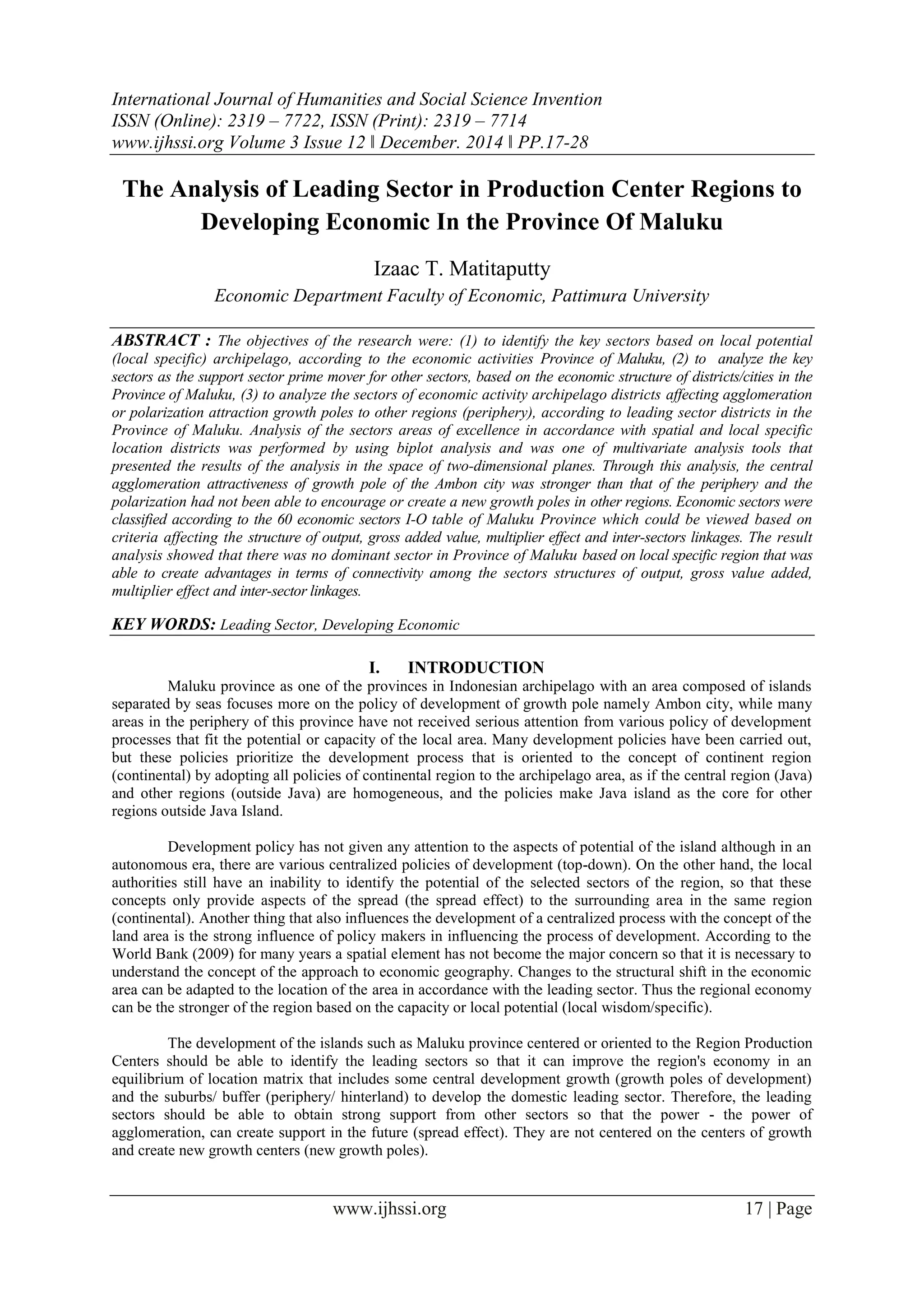 The document analyzes key economic sectors in the Maluku province of Indonesia to identify local potential and leading sectors that may drive economic development. It applies a biplot analysis to assess the connectivity and impact of various economic activities, revealing that no single sector dominates in facilitating inter-sectoral linkages. Additionally, it critiques existing development policies for lacking focus on local specificities, which limits their effectiveness in promoting sustainable growth in both central and peripheral regions.