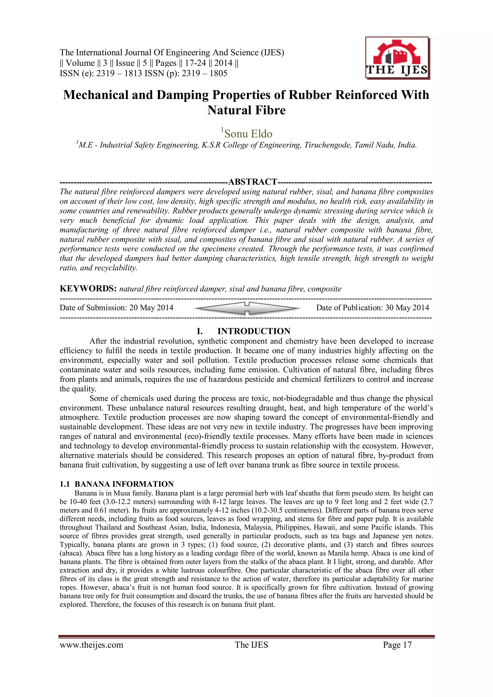 This document reports on the development of natural fibre reinforced dampers using natural rubber, sisal, and banana fibre composites, highlighting their low cost, renewability, and better damping characteristics. Performance tests on the manufactured specimens confirmed that the sisal fibre reinforced rubber had superior damping characteristics and strength. The research emphasizes the potential use of banana fibers from discarded trunks and highlights environmentally friendly practices in textile production.