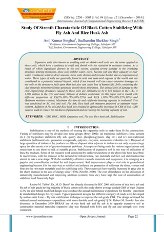 The document discusses the stabilization of expansive black cotton soil using industrial by-products like fly ash and rice husk ash to enhance soil properties for construction purposes. It details the methodology and results of experiments, demonstrating significant increases in California Bearing Ratio (CBR) and changes in moisture content and density when these materials are added. The study emphasizes the potential of such mixtures to reduce construction costs and improve road durability.