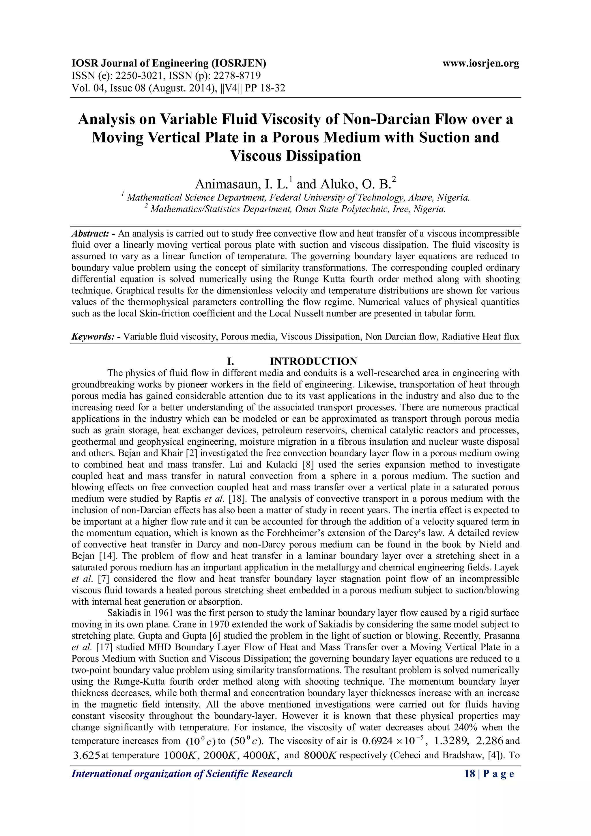 This document presents an analysis of free convective flow and heat transfer of a viscous incompressible fluid over a linearly moving vertical porous plate with suction and viscous dissipation. The fluid viscosity is assumed to vary linearly with temperature. Governing boundary layer equations are non-dimensionalized using similarity transformations and reduced to a boundary value problem. The problem is solved numerically using a shooting method along with the 4th order Runge-Kutta method. Results for dimensionless velocity and temperature distributions are presented for various parameter values, and skin friction and Nusselt numbers are reported in tables.