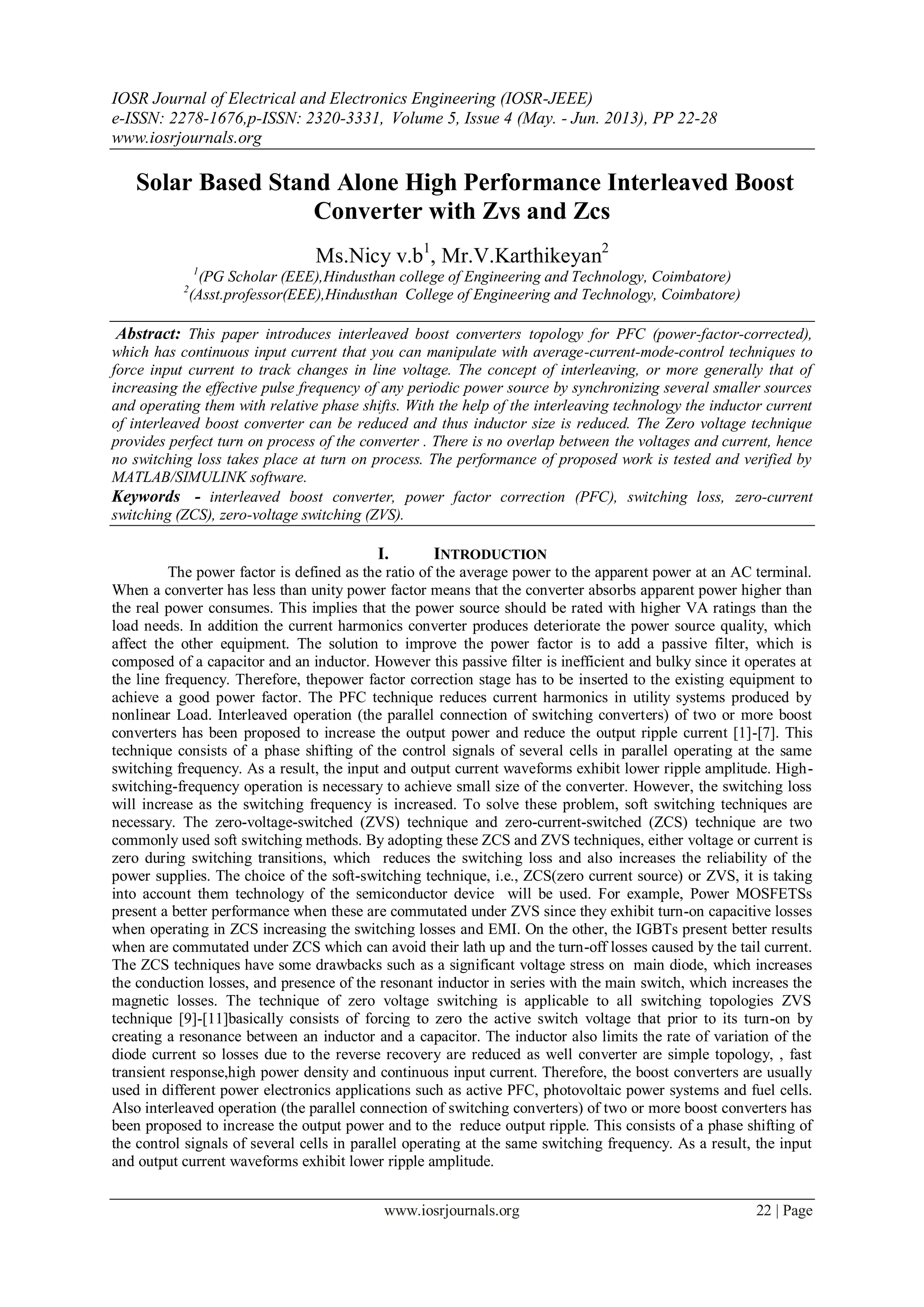 This document summarizes a research paper on a solar-based interleaved boost converter with zero-voltage switching and zero-current switching. The converter uses two boost converters connected in parallel with a phase shift to reduce ripple and improve efficiency. Soft-switching techniques are used to reduce switching losses. Simulation results show the converter maintains a constant output voltage while the induction motor output varies with time, and PWM signals control the switches. The converter achieves a power factor of 0.93 and performs efficiently for power conversion from solar panels.