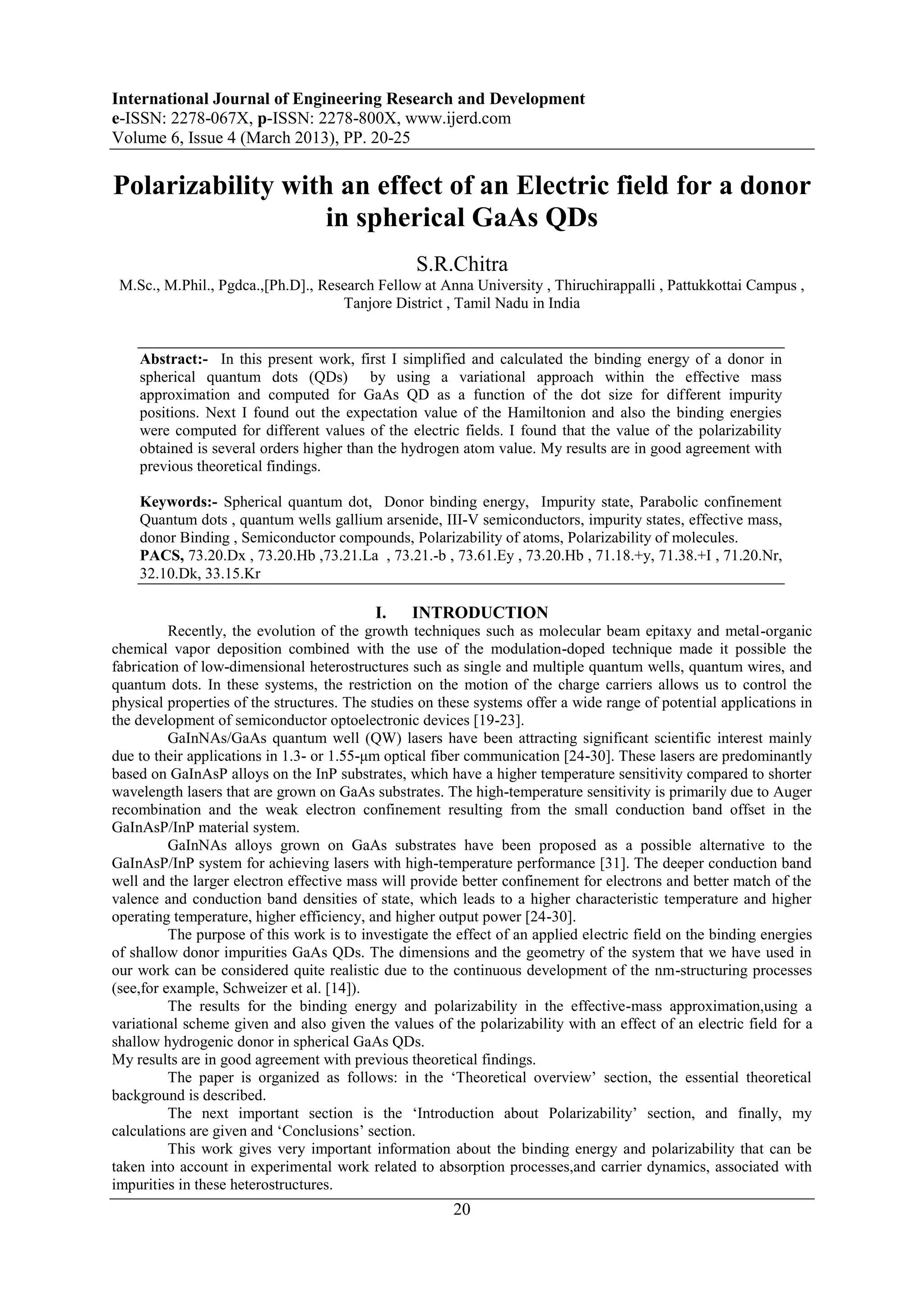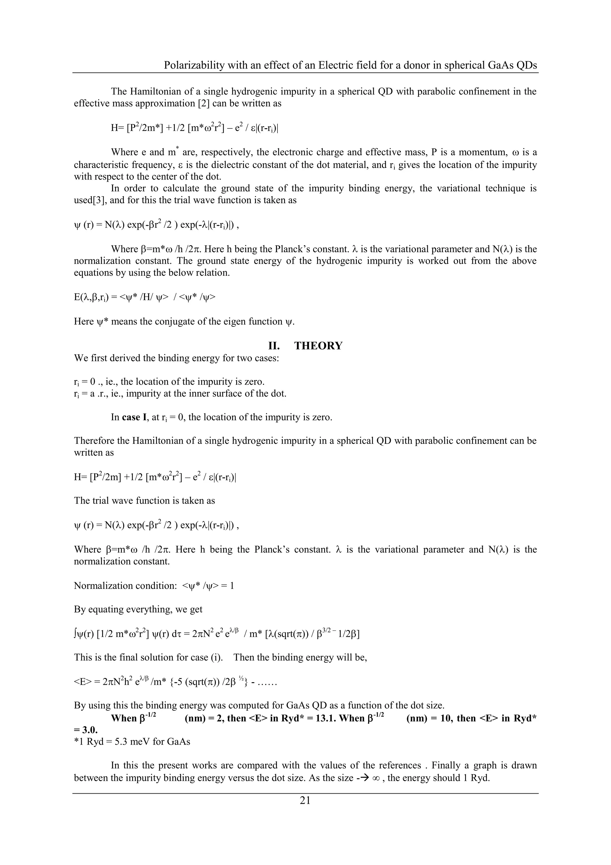 The document summarizes research on the polarizability of donors in spherical gallium arsenide (GaAs) quantum dots (QDs) under an applied electric field. The author uses an effective mass approximation and variational method to calculate: